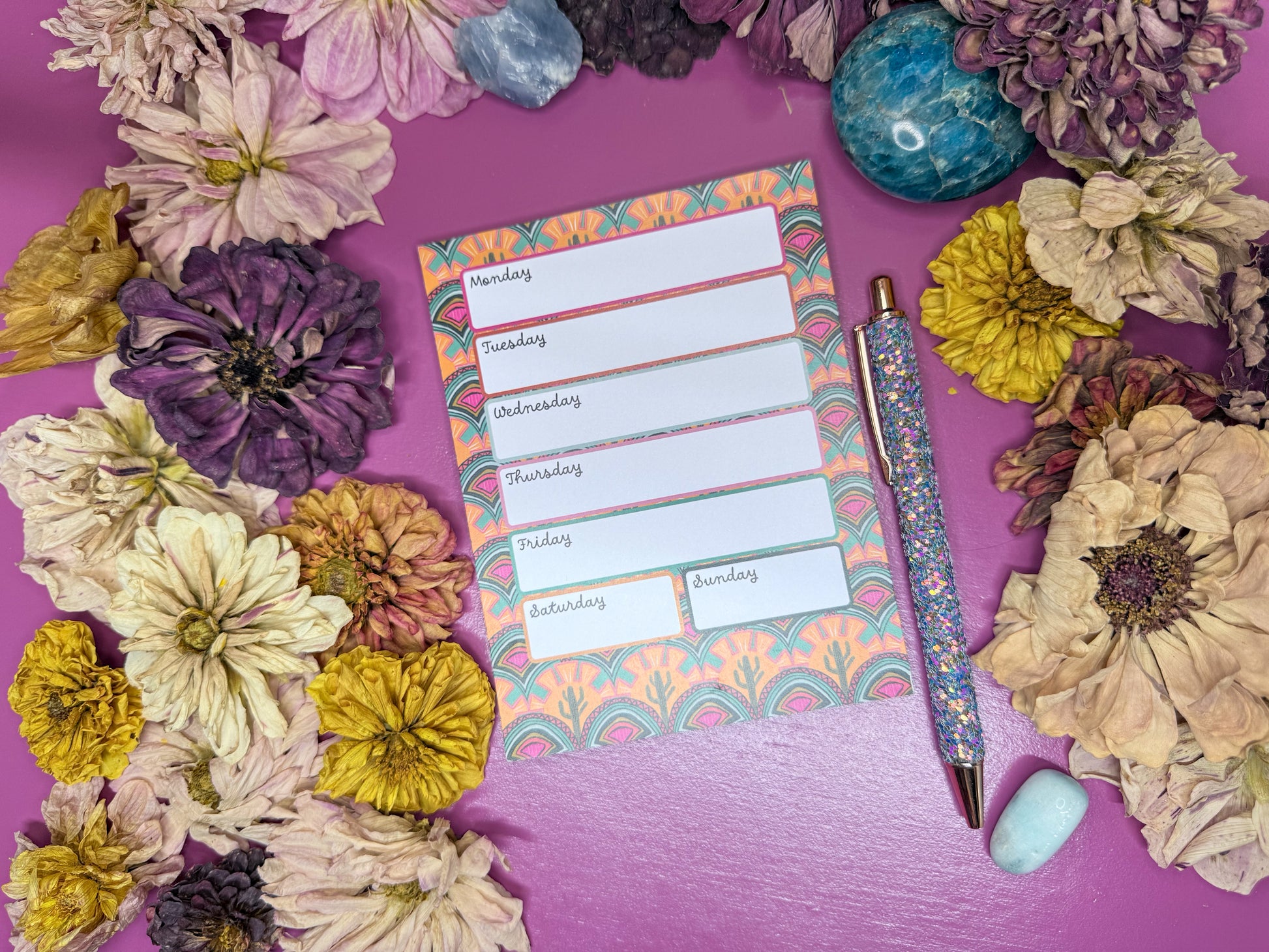 Inspired by warm desert landscapes and sun-soaked color palettes, this mini planner notepad features original hand-drawn artwork that captures a sense of calm, openness, and quiet beauty.